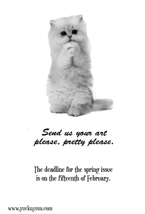 Let’s not forget the wider Yuck ‘n Yum extended family – that’s right, *you*! Our contributors are our second cousins once-removed, and we would have no zine without you. Our spring deadline is approaching fast (March 15), please do send us your work for inclusion in the Spring 2013 issue.