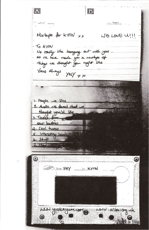 Kill Your Timid Notion Festival was an audio and video festival which took place at Dundee Contemporary Arts from 2003 until 2010. As part of the last KYTN Yuck ‘n Yum were asked to make an audio work. We combined bluetooth technology and our website to release a curated mixtape from Dundee based artists to the audience of the festival and beyond.