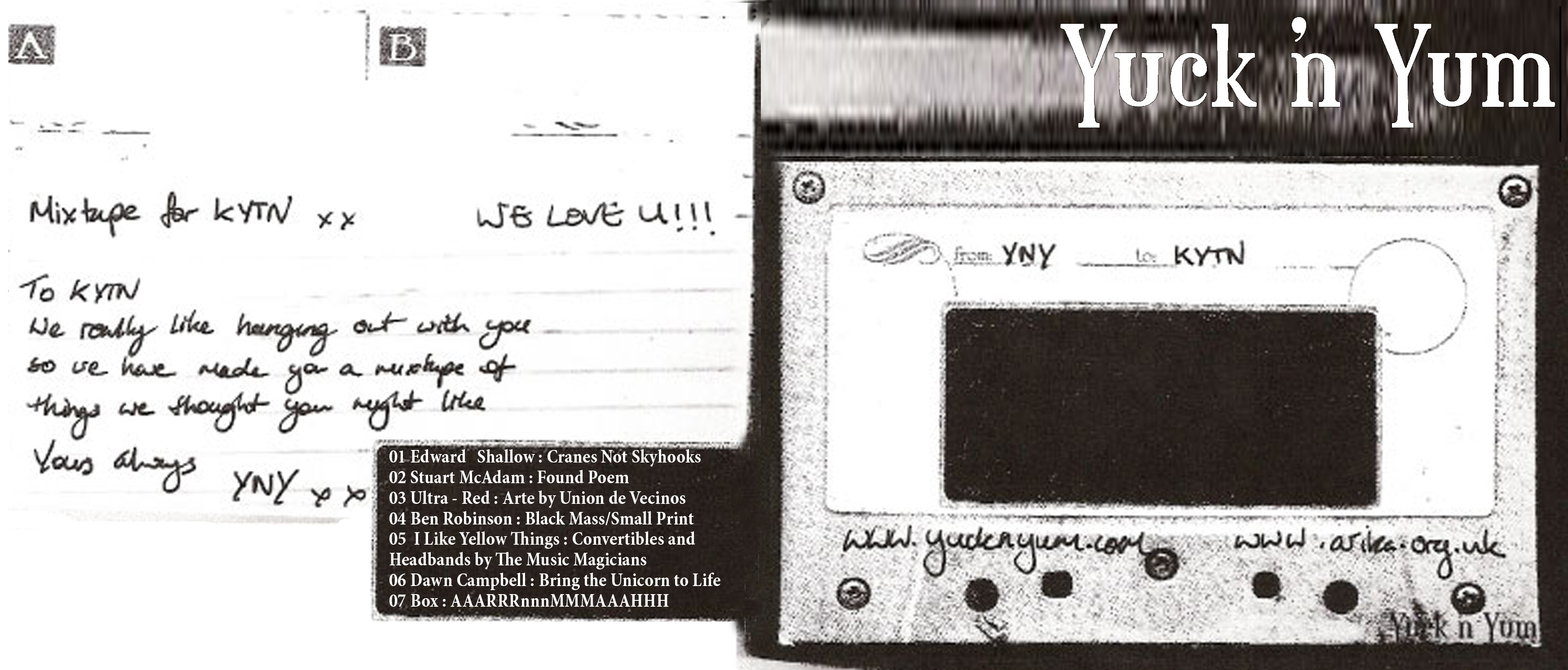 Kill Your Timid Notion Festival was an audio and video festival which took place at Dundee Contemporary Arts from 2003 until 2010. As part of the last KYTN Yuck ‘n Yum were asked to make an audio work. We combined bluetooth technology and our website to release a curated mixtape from Dundee based artists to the audience of the festival and beyond.